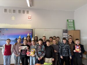 Z okazji setnej lekcji matematyki uczniowie przygotowali niespodzianki. Na głowach pojawiły się urodzinowe czapeczki, a wspólne świętowanie umiliły słodkie i słone przekąski. To wydarzenie pokazało, że nauka może iść w parze z radością i wspólną zabawą.